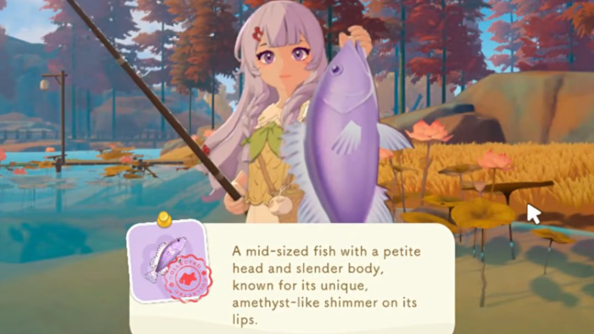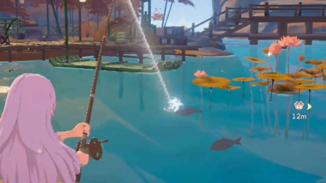 To fish, look for ripples and fish shadows in rivers or the ocean. Select your rod, hold the cast button (Left Mouse on PC, RT on Xbox), aim, and release. When the bobber gets pulled underwater with a big splash, hold the cast button again to reel in. Watch the line color — if it turns red, release briefly before holding again, or the line snaps.