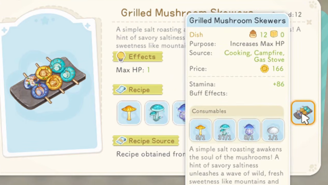 | Grilled Mushroom Skewers | 1× Sunveil, 1× Moondew Shroom, 1× Mirthshroom, 1× Fine Salt | 166 |