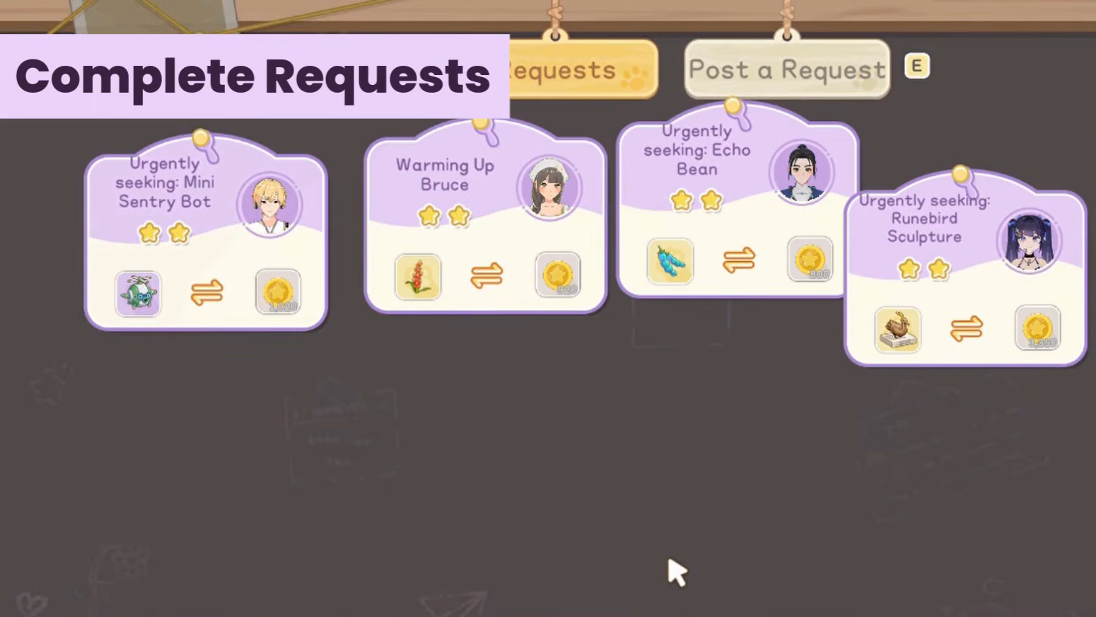Every request asks you to deliver a specific item to an NPC within a time limit. Completing them rewards coins, Starsand currency, and relationship points with that NPC. The payouts can be surprisingly generous — delivering five Peppers for a single request can net over 1,000 coins.