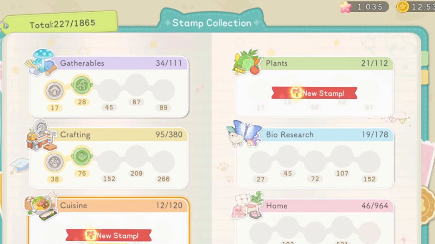 The Islandpedia's Stamp Collection rewards you with coins just for playing the game normally. Every item you gather, craft, cook, catch, or buy registers in the catalog, and hitting collection milestones earns stamps with attached rewards. The Gatherables category alone pays out 1,500 coins at 17 items, 3,000 at 28, and 7,000 at 45. The Crafting category scales even higher, topping out at 25,000 coins for 266 items collected.