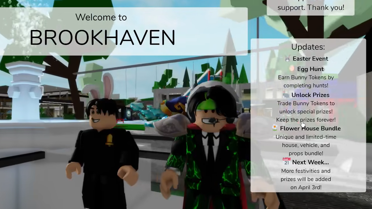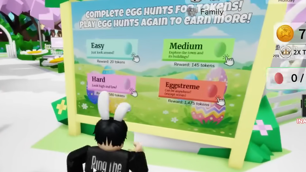 Brookhaven's Easter event runs March 27 through April 3 and splits its egg hunt into four difficulty tiers: Easy, Medium, Hard, and Extreme. Collecting eggs earns Bunny Tokens, which you can exchange for rewards like the Spring Shuffler, Easter Truck, Easter House, and themed props.
