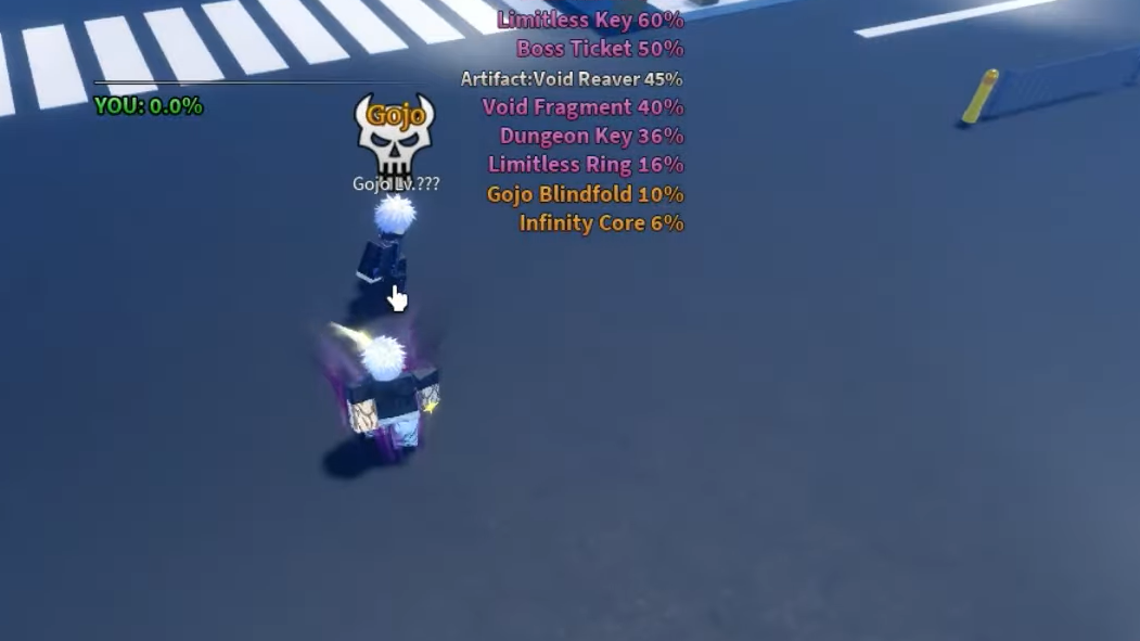 Uses the same NPC but costs 1 Limitless Key (dropped by Gojo at 30%). Difficulty-scaled drops include Reversal Pulse (15–25%), Six Eye (6–8%), Blue Singularity (2–3%), Gojo Haori (1.25–2%), Infinity Essence (0.65–0.9%), and the Strongest Sorcerer title (1–1.5%).