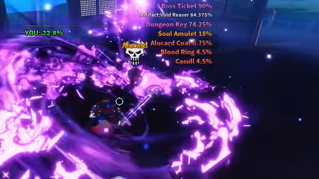 Alucard alternates with Jinwoo on Sailor Island, so only one of them is active at a time. He doesn't drop Haki Color Rerolls, but Race Reroll (85%) and Trait Reroll (80%) rates are among the highest of any boss. Unique loot includes Soul Amulet (8%), Alucard Coat accessory (3%), Casull (2%), Blood Ring (2%), and the Vampire King title (2.5%).