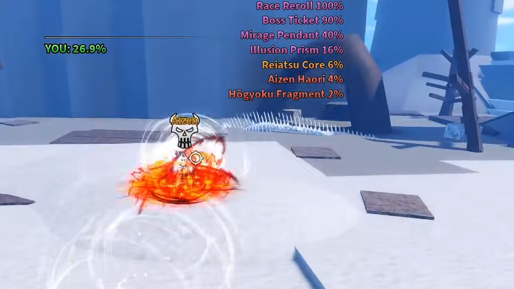 Aizen stands out for having a guaranteed Haki Color Reroll (100%) and an 85% Race Reroll rate. His rare drops are Mirage Pendant (20%), Illusion Prism (8%), Reiatsu Core (3%), Aizen Haori accessory (2%), Hogyoku Fragment (1.2%), and the Manipulator title (2%).