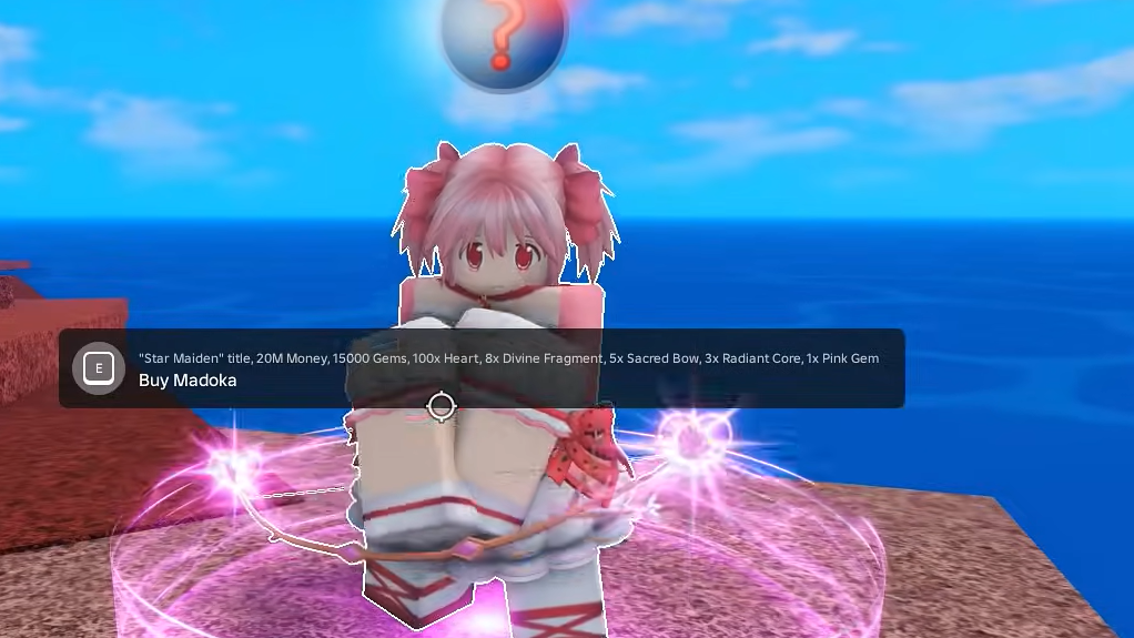 Madoka guarantees Race Reroll, Trait Reroll, and 1–2 Hearts on every kill. Boss Tickets drop at 55% and Dungeon Keys at 45%. The rarest rewards are Divine Fragment (6%), Sacred Bow (4%), Radiant Core (2%), Ultimate Wings (1.5%), Pink Gem (0.75%), and the Star Maiden title (1.2%).