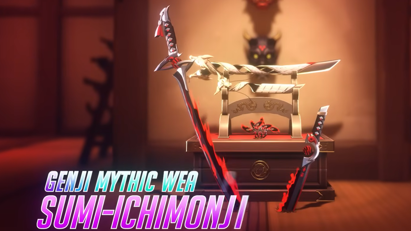 Genji — Sumi Ichimonji (Mythic Weapon): A katana with a fiery effect layered over a solid black blade. The weapon includes a unique flourish animation where Genji fans his shuriken through his fingers. As a mythic, it will have customizable visual options and special kill effects.