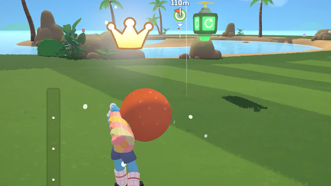 Super Battle Golf throws out the quiet, polite conventions of the sport and replaces them with homing missiles, landmines, and a rideable golf cart that can seat eight. Scattered across every course are purple suitcases stamped with question marks, and cracking one open gives you a random item from a pool of ten. Each serves a distinct purpose — stunning opponents, boosting your movement, shielding yourself, or flat-out sabotaging someone's swing.