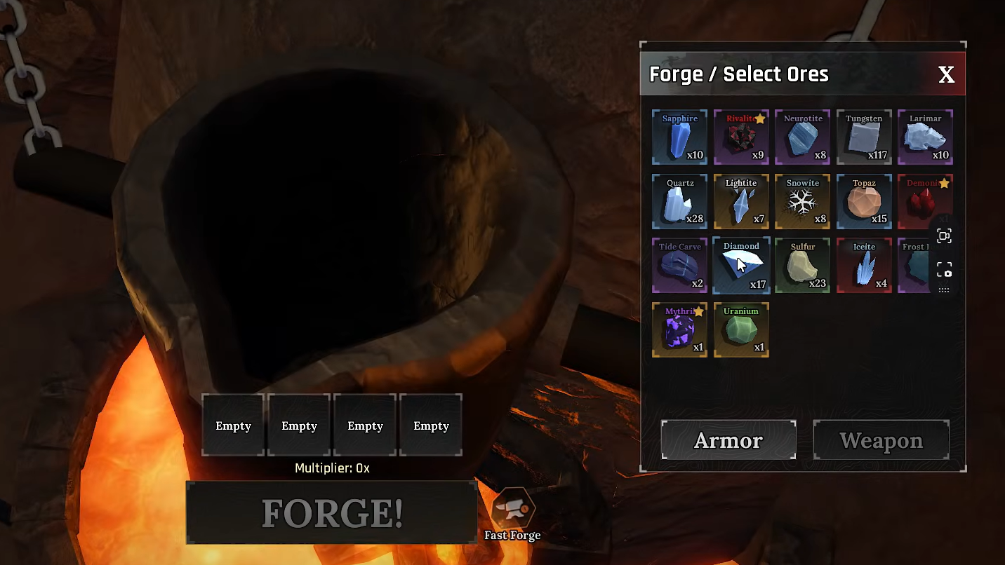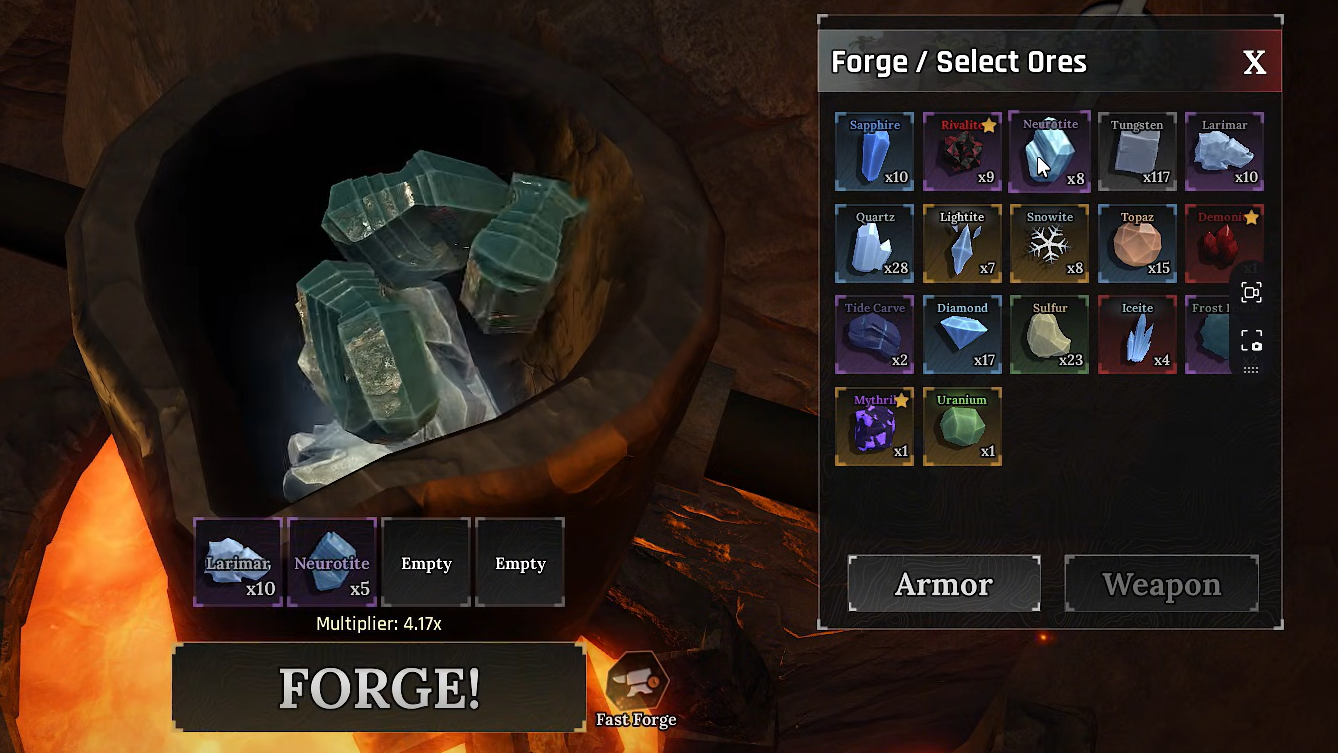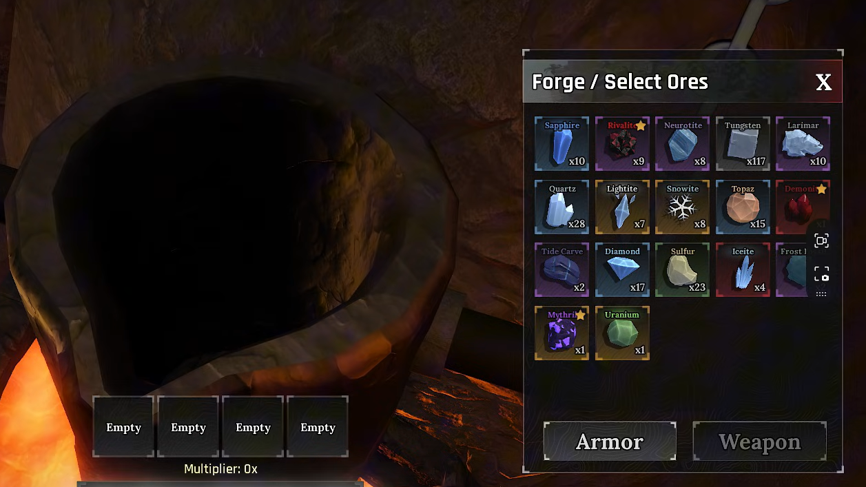 When you combine multiple trait ores in a single recipe, the resulting item can inherit all their passives. A heavy chestplate forged with Eye Ore, Uranium, Mythril, and Lightite, for example, can trade health for damage, periodically pulse AoE damage, raise defense, and move faster at the same time.
