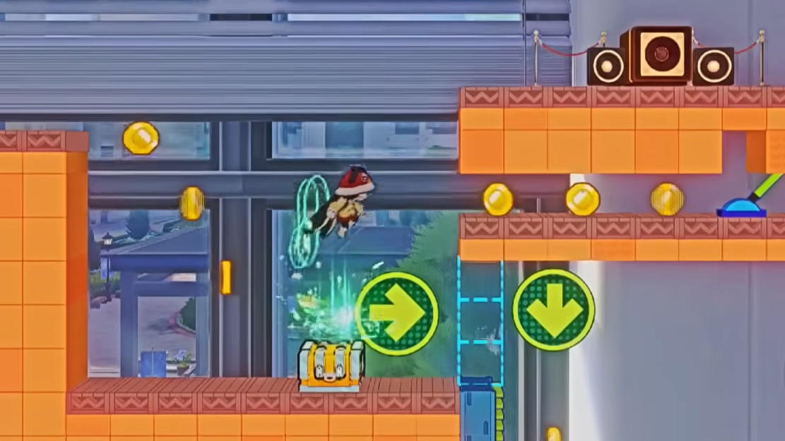 Chest 13 is on the fourth level. Use the spring to launch left and land on a ledge. Chest 14 is on the fifth level — jump left instead of dropping onto the hoop. This is the final chest in this particular puzzle.