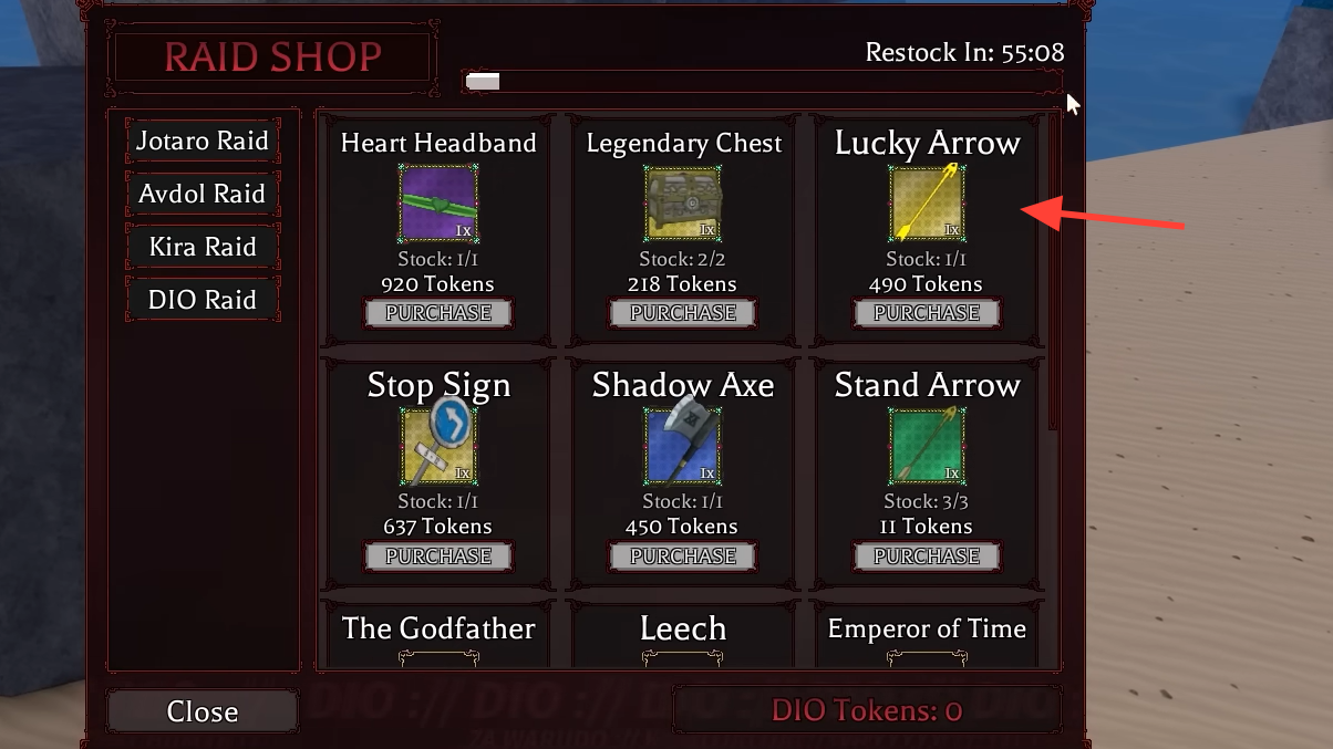 Step 3: After the raid, open the Avdol NPC's shop. You can spend the tokens you just earned to buy Stand Arrows directly — roughly 60 tokens for five arrows. The shop restocks on a timer (around 36 minutes), so you can cycle between raiding, spending tokens, and opening the chests you received.