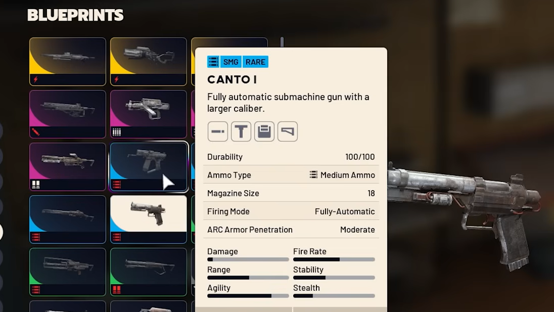 The Canto is a submachine gun that runs on Medium Ammo instead of the Light Ammo used by other SMGs like the Bobcat and the Stitcher. That makes it unusually effective against ARC enemies for its weapon class. Its blueprint appears to be tied to the Hurricane map condition — specifically, it drops from First Wave Raider caches, which only spawn while a hurricane is active. These caches appear on all maps except Stella Montis.