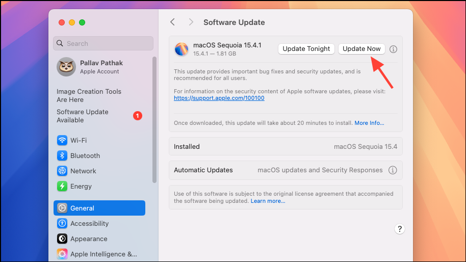 Step 4: Your Mac will check for available updates. When macOS Sequoia 15.4.1 appears, click Update Now to begin downloading the update.