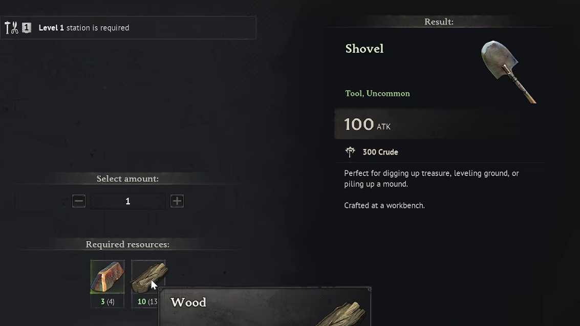 The Madman's Chest is buried, so a Shovel is mandatory. If you do not have one yet, crafting requires 3x Copper Ingot and 10x Wood at a Workbench, which in turn means you need a Pickaxe, a Kiln, and a Furnace built first. Heading to the quest marker without a Shovel is wasted travel time because nothing at the dig site is interactable otherwise.