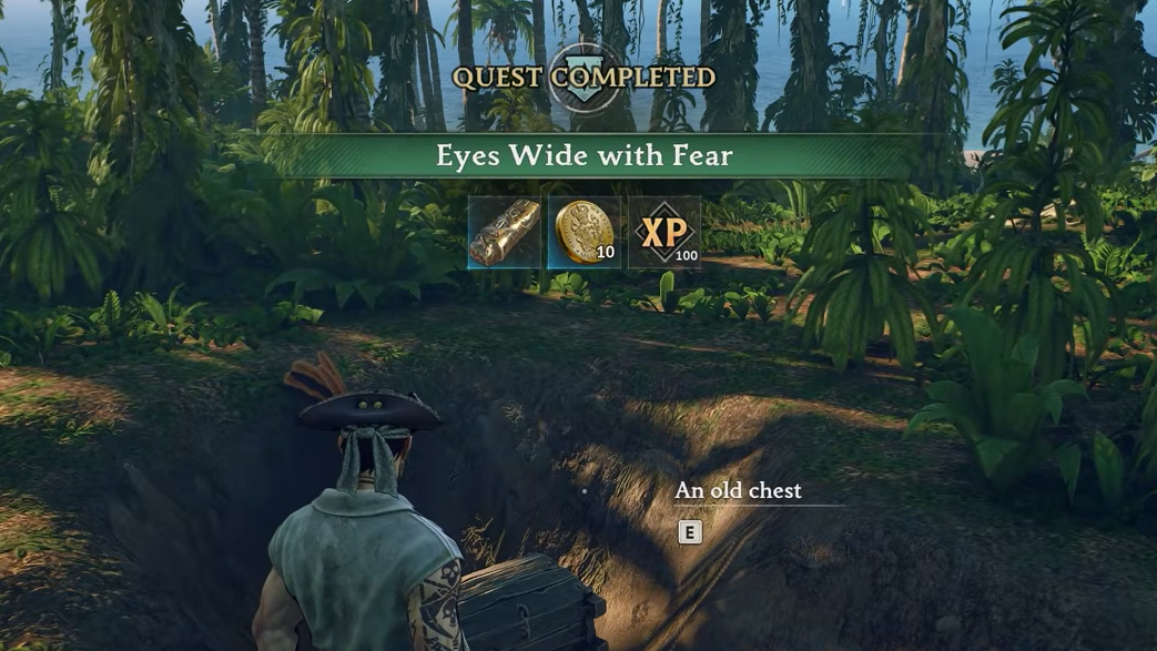 The quest officially completes once you loot the old chest after clearing the Drowned, at which point the Eyes Wide With Fear entry is removed from your active quest list and the rewards appear in your inventory.