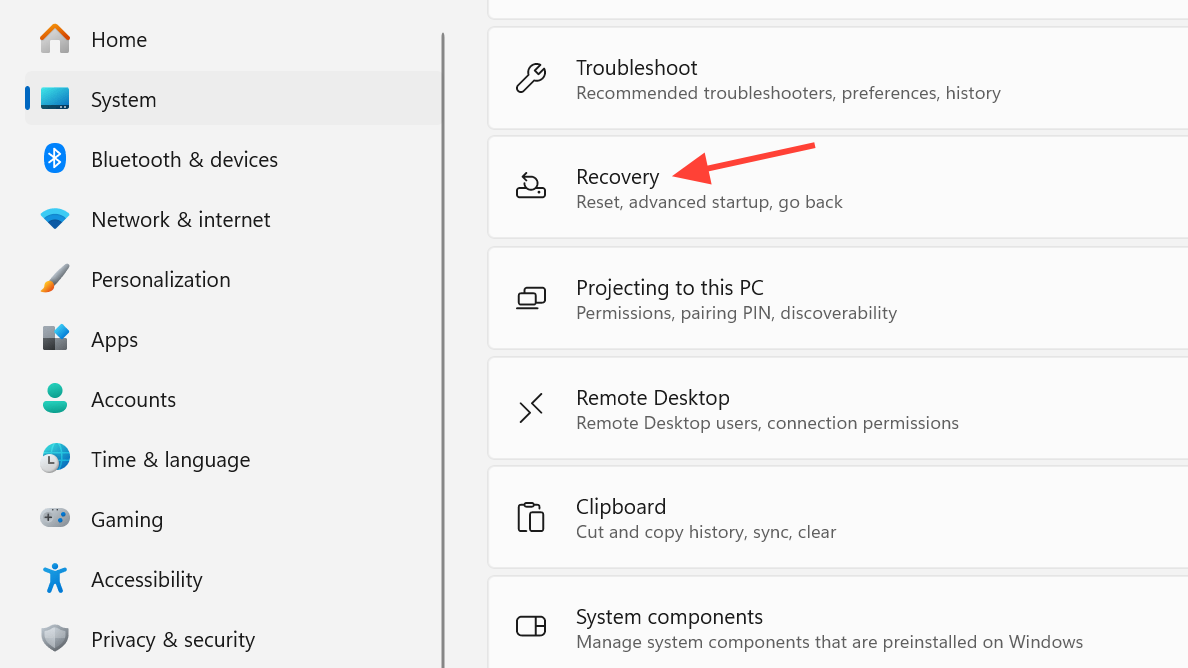 Step 4: Select Recovery. This section houses options for repairing Windows and resetting the device.