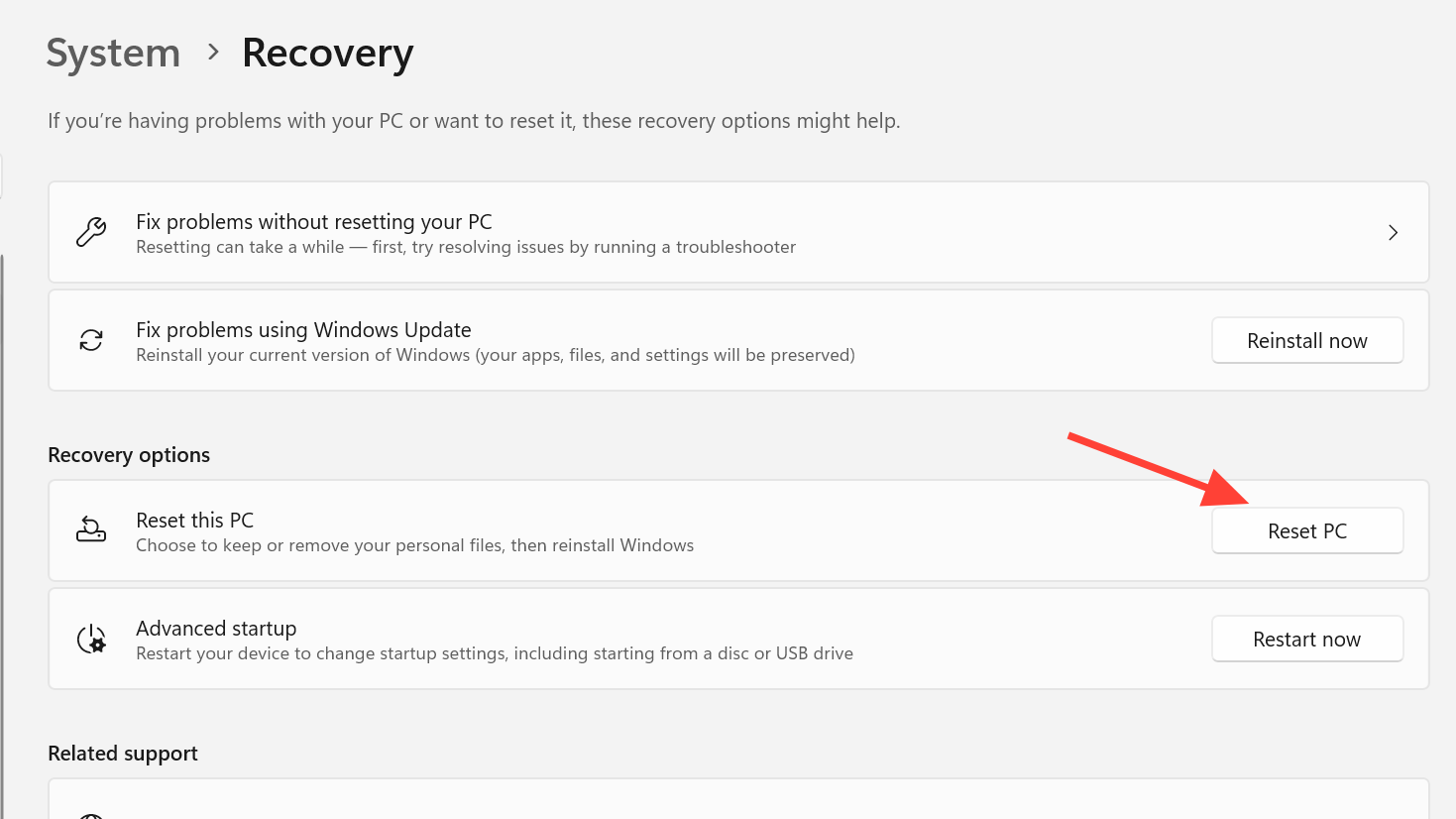 Step 5: Click Reset PC under “Reset this PC.” This launches the reset workflow that rebuilds Windows.