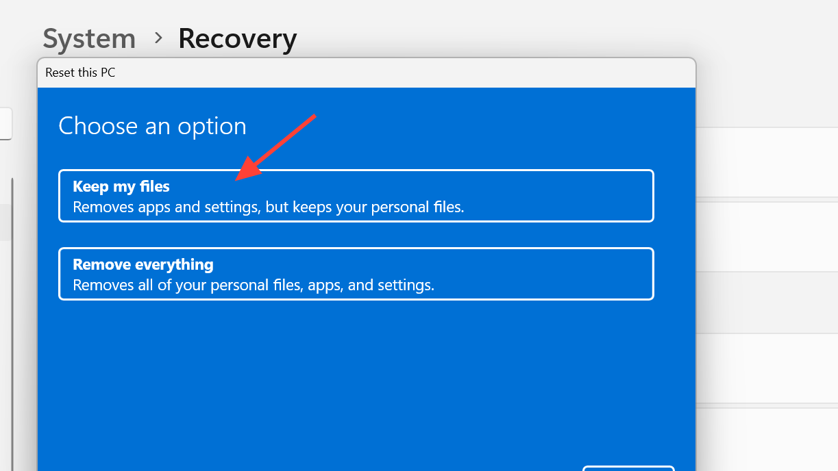 Step 6: Choose what to remove. Select “Keep my files” to retain personal folders in your profile, or “Remove everything” to wipe all user data. Apps and games are removed in both cases.