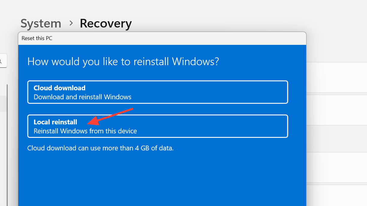 Step 7: Pick the reinstall source. Choose “Local reinstall” to use the image already on the device, or “Cloud download” to fetch a fresh copy of Windows 11. Cloud download replaces the current image and removes manufacturer customizations, drivers, and bundled utilities; you can reinstall vendor drivers later if needed.