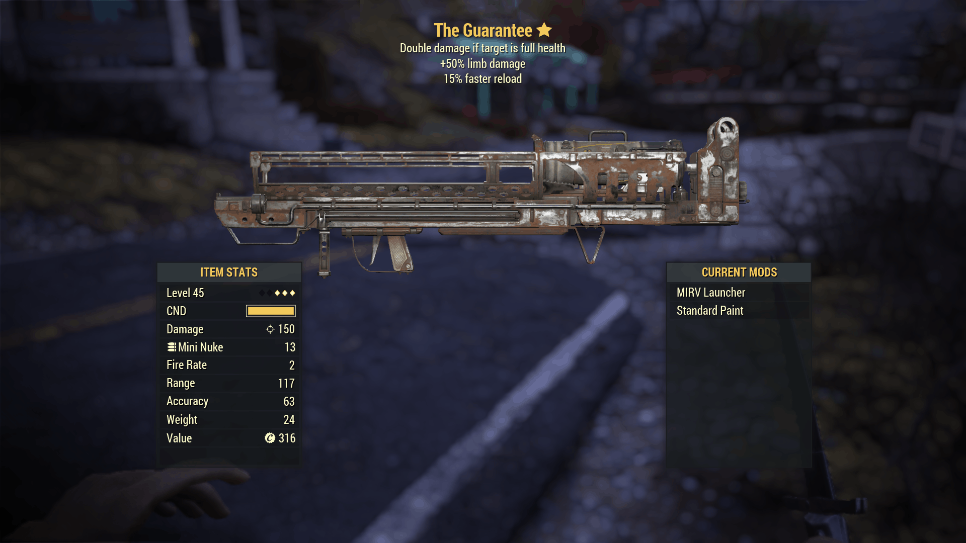 The Guarantee will do double the damage if the enemy has full health. Also, there is +50% limb damage (same as crushing blow) and 15% faster reloads with the legendary edition of the gun.