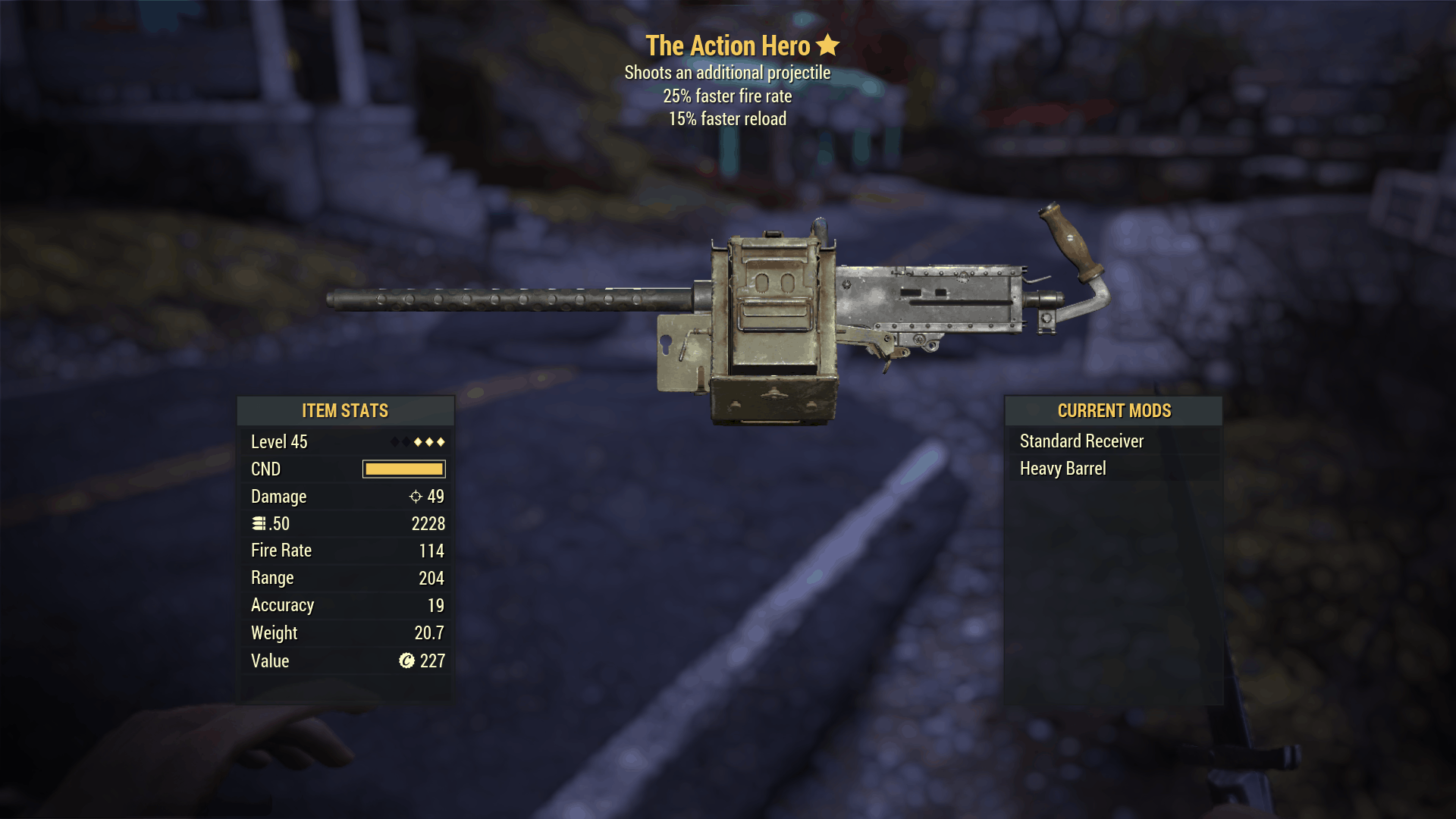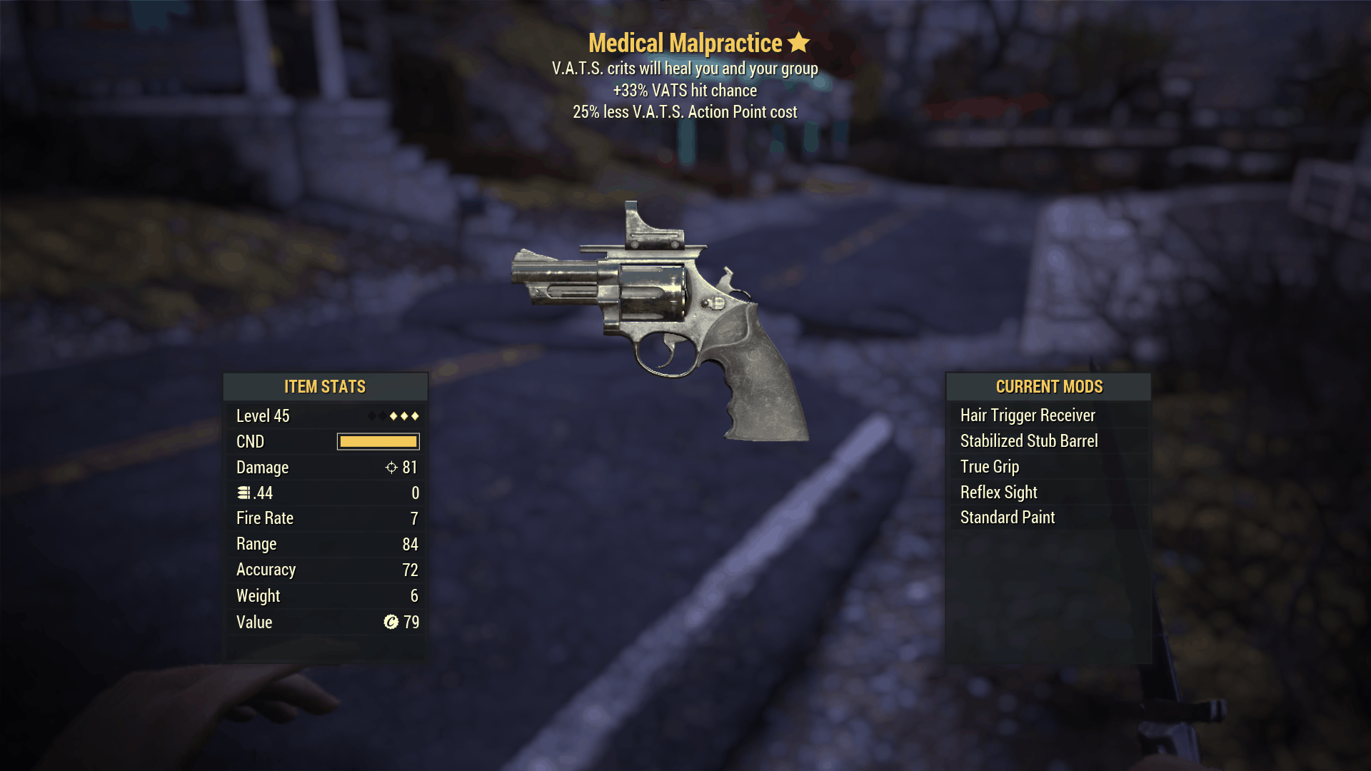 This .44 Pistol with the legendary stats will now have V.A.T.S crits that will heal both you and your group, useful in gunfights where you have the disadvantage at some point. The V.A.T.S will also have 33% more chance of hitting with 25% less V.A.T.S actions points.