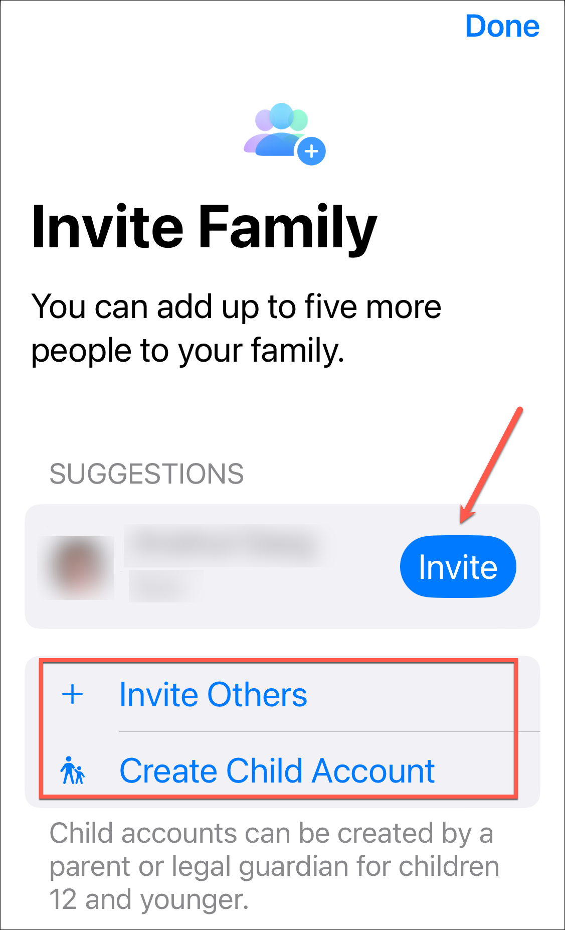 Then, invite the people you want to include in your family group. You can invite up to 5 more people to be in the group. You'll also get suggestions for inviting people. If your child (who's 12 years or younger) does not have an Apple ID yet, you can also create an account for them on the fly and add them to the family group.