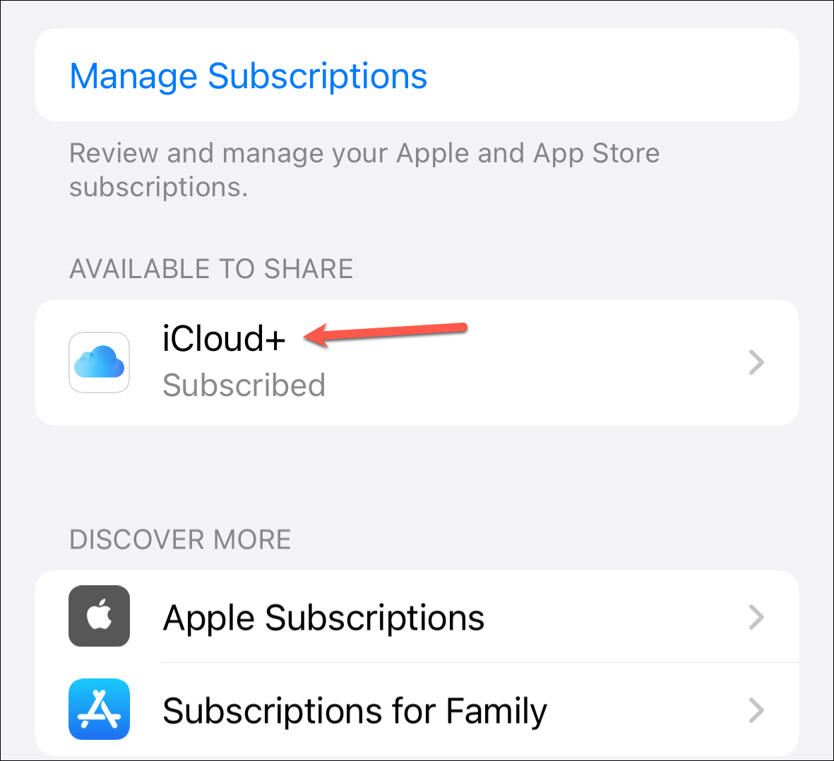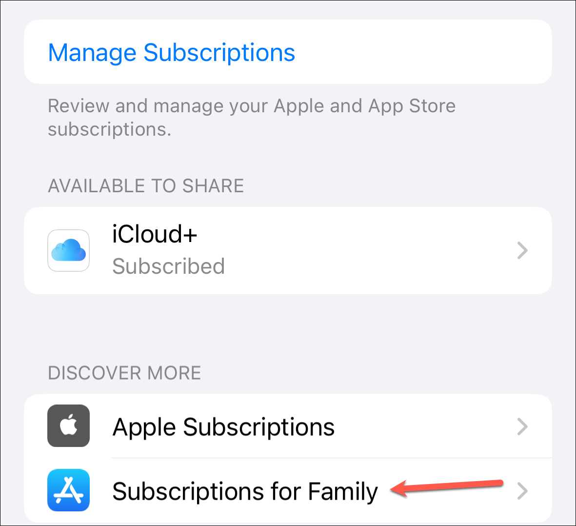 To find more subscriptions that you can share with your family, tap the 'Apple Subscriptions' or 'Subscriptions for Family' options under Discover More.