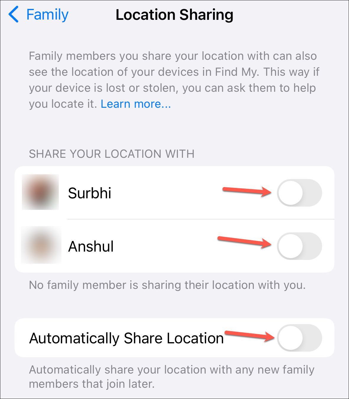 Then, enable the toggle next to those family members with whom you want to share your location. If you want to share your location with family members by default, enable the toggle for 'Automatically Share Location'.
