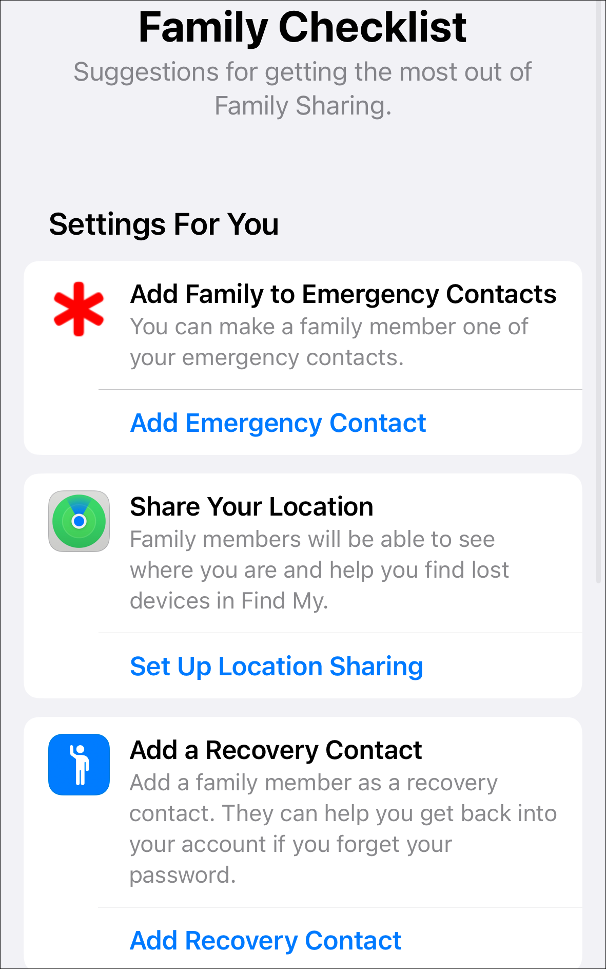 This checklist contains other items that you can configure for your family to make the most out of this feature. Depending on the settings you have already configured and the members in your group, suggestions might differ. But you might get suggestions for setting up Parental Controls, Emergency Contact, Location Sharing, Recovery Contact, Legacy Contact, etc.