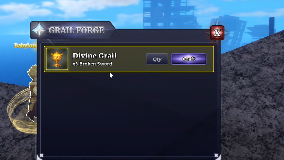 The Divine Grail is the more accessible craft — just three Broken Swords per grail. You use Divine Grails to summon the King of Heroes boss, which drops materials needed to unlock the King of Heroes fighting style and its F move. The Babylon Key is a much heavier investment at 100 Broken Swords plus additional Legendary and Mythical materials, so plan your farming sessions accordingly.