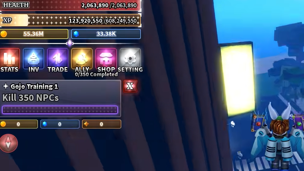 Collecting three Limitless Rings is only part of the process. To actually obtain the Gojo combat moveset, you need to find the Limitless Sorcerer NPC — a separate, non-hostile version of the boss — standing on top of a skyscraper in the northeast corner of the Shibuya Station map. Speaking to this NPC reveals three objectives you must complete before the fighting style becomes available for purchase.