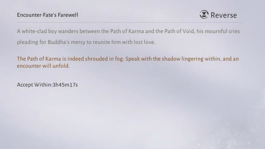 Fate’s Farewell is a compact Encounter, but its weather-gated trigger on the Path of Karma makes it easy to miss. Once the fog condition is met and Nie the Scholar appears, the rest of the quest is a straightforward tour through Qinghe that ties together the Path of Karma, Wraith Village, and Riverview Terrace into a single, melancholic story.