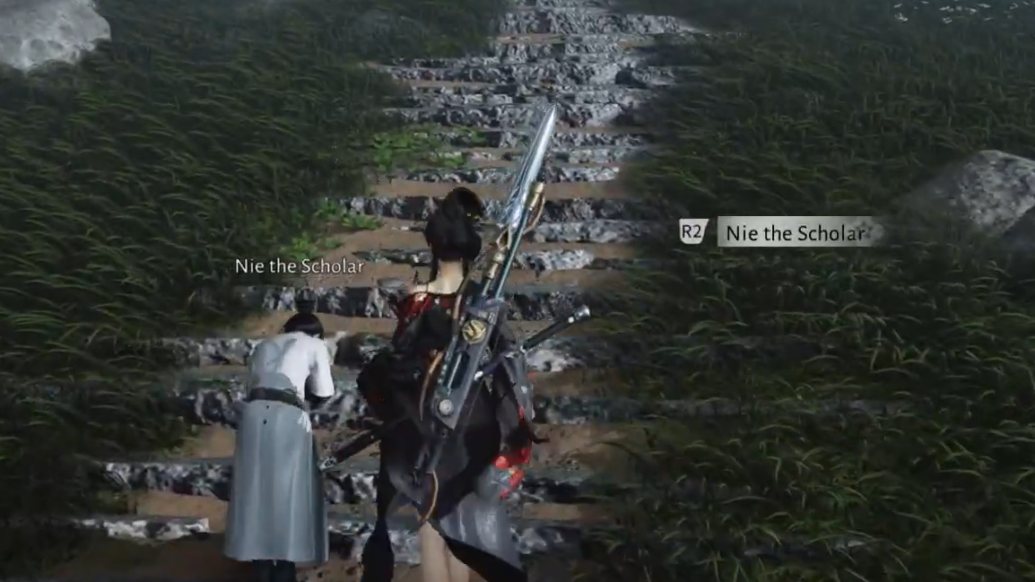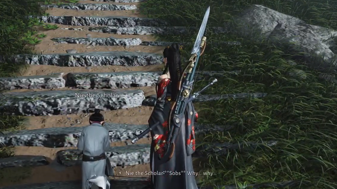 Step 1: After the encounter triggers, walk up the stairs along the Path of Karma. A young man in white, Nie the Scholar, stands in the middle of the road. Approach him to initiate the encounter. He will move up the stairs and barely respond to you.
