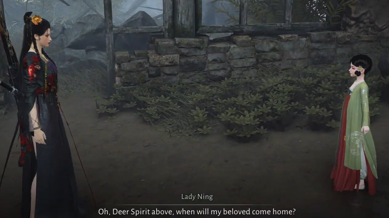 Step 3: Inside the ruined house, interact with Lady Ning. Hand over Nie’s Deer Immortal Pendant / jade keepsake when prompted. After the scene, Lady Ning disappears.