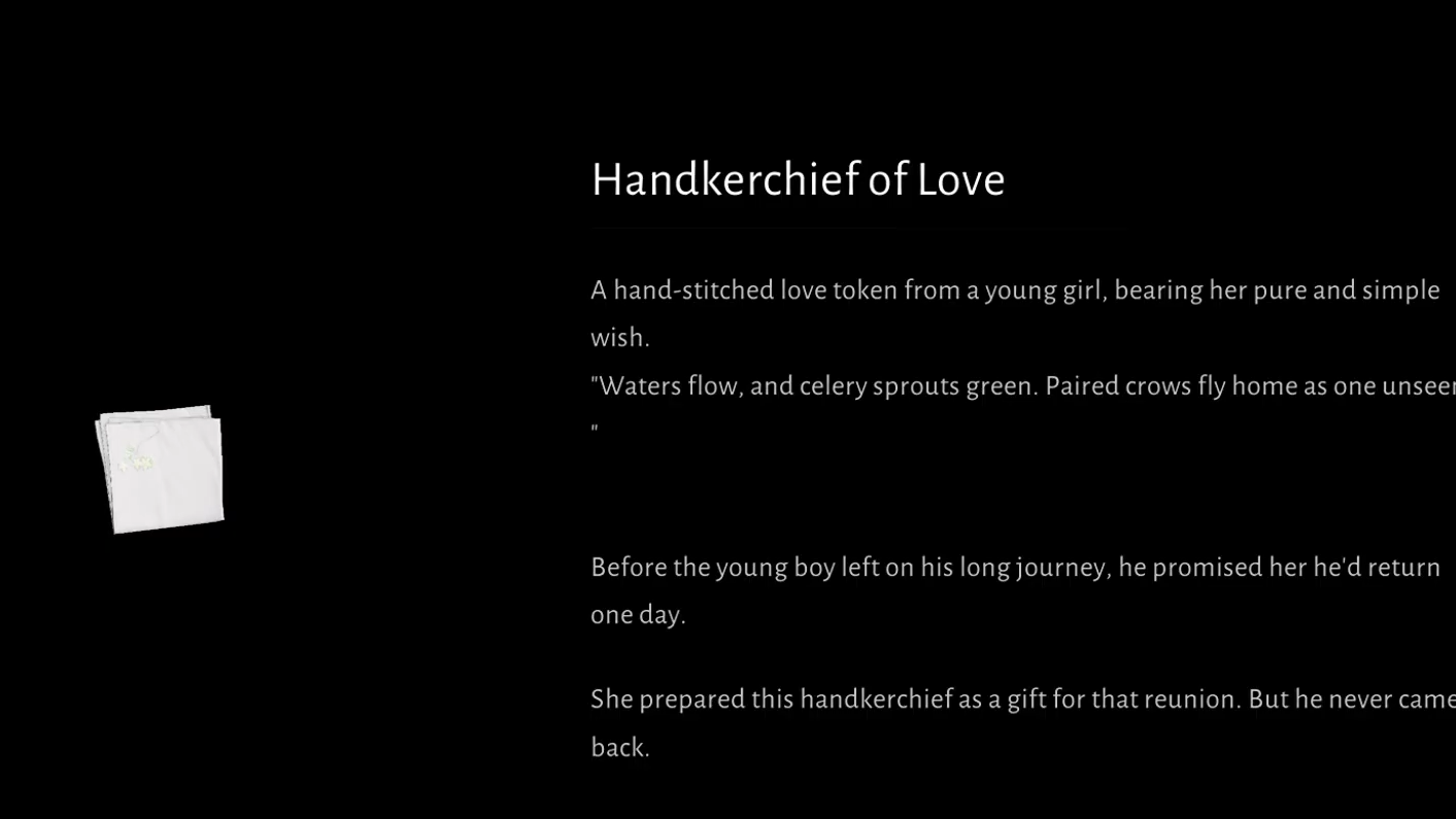 Step 4: On the spot where she stood, a handkerchief is left behind (named Handkerchief of Love in one description). Pick it up. This item now becomes your link back to Nie.