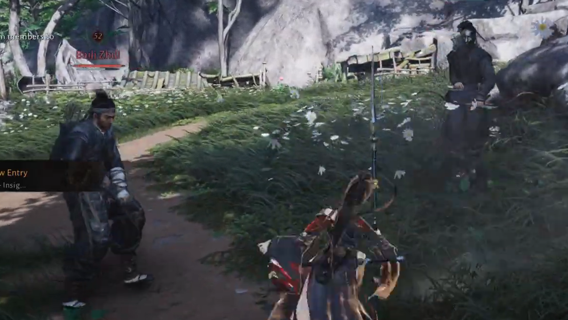 Step 2: Keep following the path upward. You will soon meet Baili Zhui and Baili Zong from the Aureate Pavilion. Talk to them when prompted; they are searching for a monk they call Miaoshan and offer a reward for any clues.