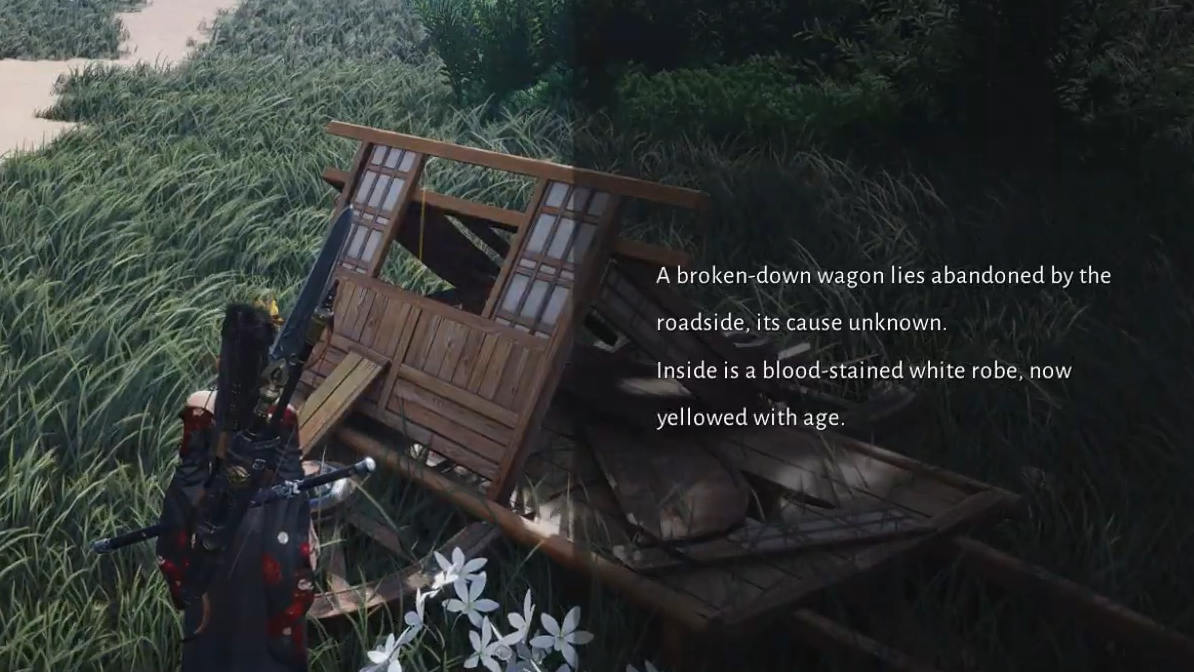 Step 3: Investigate the wagon. Interact with the area to examine a blood-stained white robe inside the wreckage. This confirms the fate implied by the encounter’s name.