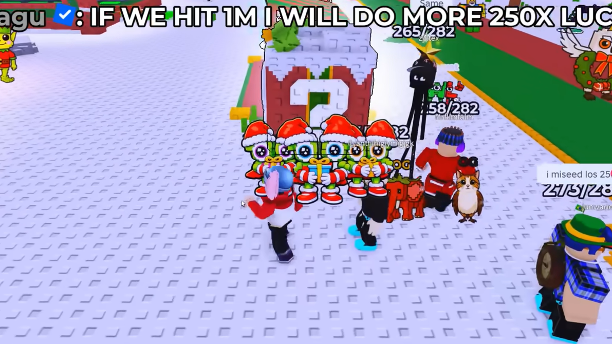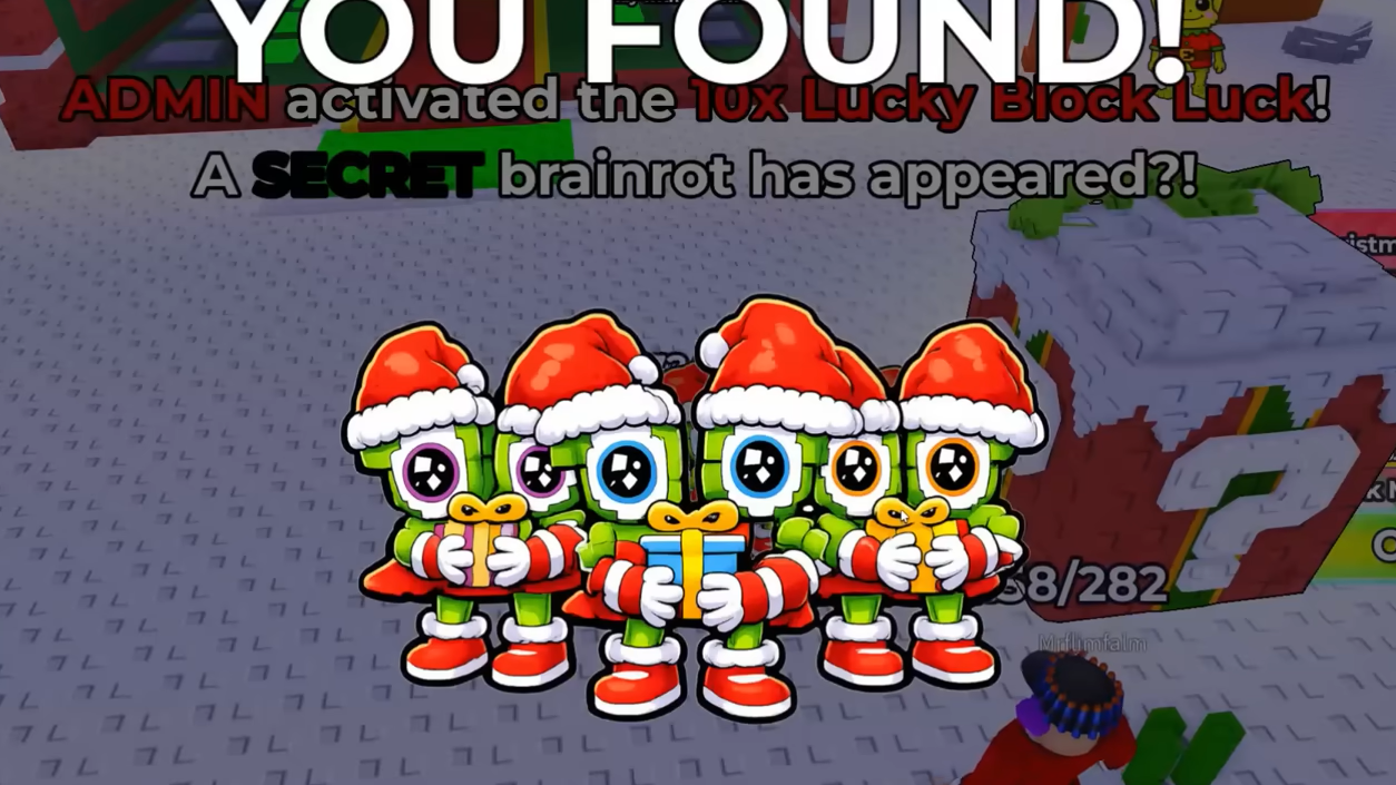 - Christmas Lucky Blocks near the Christmas map’s Robux Shop, which pay out Pandanini Frostini, Triplito Tralaleritos, Santa Hotspot, Chimnino, Los 25, Reinito Sleighito, La Ginger Sekolah, and the god-tier Chrismasmamat.