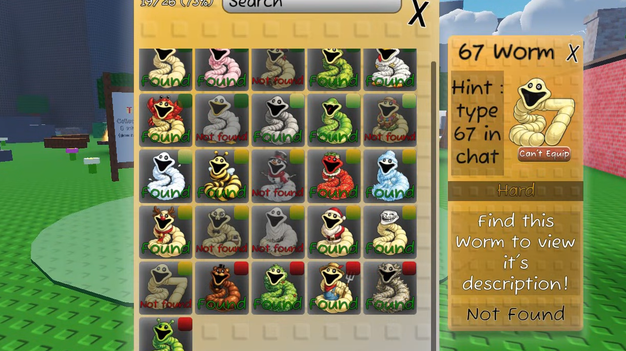 Each worm collected awards a badge visible in your Roblox badge inventory. Check the in-game index to track which worms you have found and which remain. The index displays all 26 worm slots, with collected worms highlighted or marked.