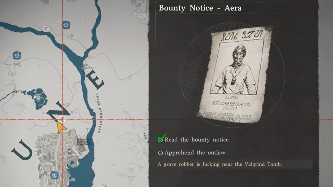 The bounty poster marks Aera's last known position north of Pailune Town, near Valgrind Tomb. This is her most reliable spawn point and makes thematic sense — she's a grave robber, and Valgrind Tomb is a major point of interest visible on the world map. To reach her, exit Pailune through the northern route and follow the path toward the tomb. Along the way, you'll pass underneath a fallen tree. Aera hides in the tall grass patches in this area, wearing a cloth mask over her face in typical graverobber fashion.