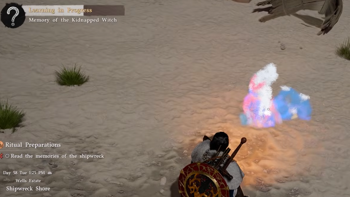 Before the three items become available, you need to complete the quest's first objective. Head to the beach and clear out the enemies inside the small orange search area on your minimap. Once the area is safe, equip your lantern and aim it at the ground near the center of the search zone. You're looking for faint blue ghostly outlines — when you spot them, hold your focus on them until the "Learning in Progress" pop-up appears and you learn Memory of the Kidnapped Witches.