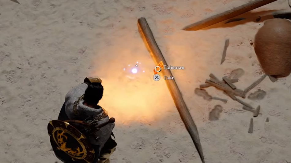 Head to the northern part of the yellow zone. You'll see a shipwreck partially buried in the sand. The Talisman is sitting on the ground right in front of it. Make sure you've dealt with any remaining enemies in the area first, since combat can interrupt the pickup prompt. The map marker points directly to this spot, so it's hard to miss.