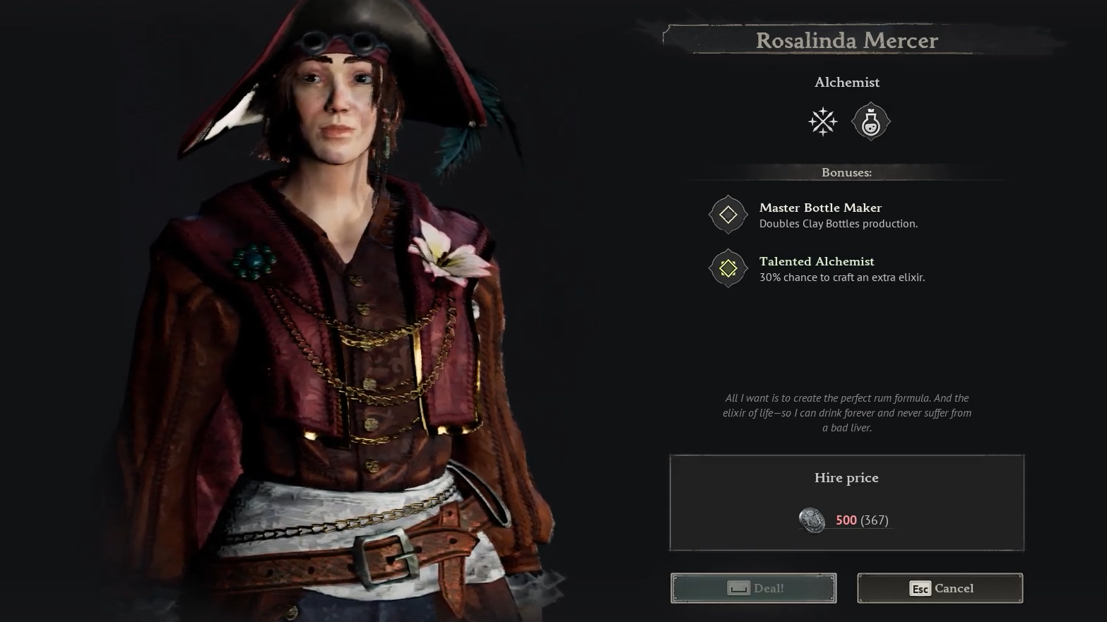 Hiring Rosalinda costs 500 Piastre, which is the standard rate for crew members in Windrose. For that price, she brings two distinct crafting traits that apply when she's assigned to the Alchemy Table.