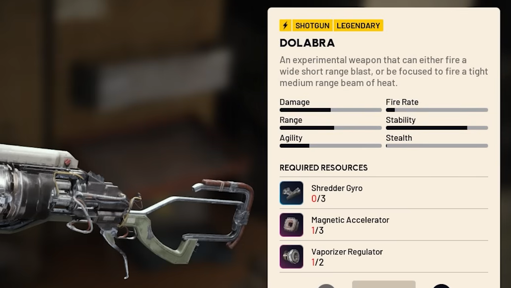 The Dolabra is notable for being the first Legendary weapon that doesn't require a Queen or Matriarch core. That said, the crafting cost is still significant. Vaporizer Regulators only drop during Close Scrutiny, and they're also needed for the High-Gain Antenna project, so every player farming the Dolabra is competing for the same limited enemy drops.
