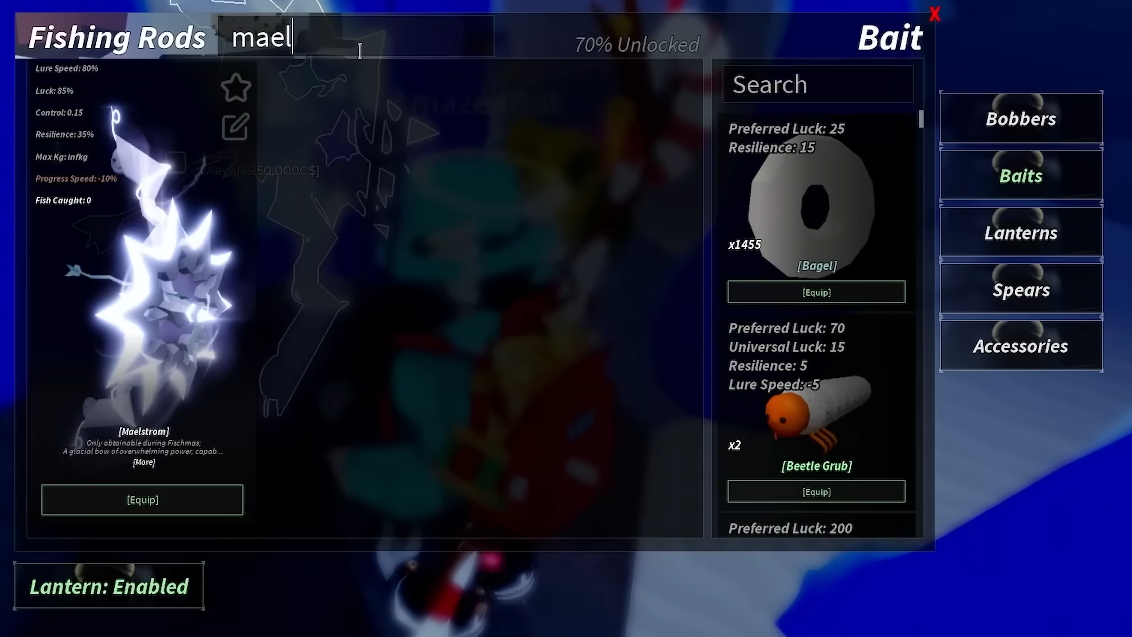 Maelstrom is positioned as the chase rod tied to the Cryoshock Cellar run. Its listed stats include 80% L speed, 85% luck, 15 control, 35% resilience, infinite max KG, and negative progress speed. It also uses a distinct “charge” style bar interaction during its passive, where building the charge to roughly three-quarters can add a noticeable burst of progress.
