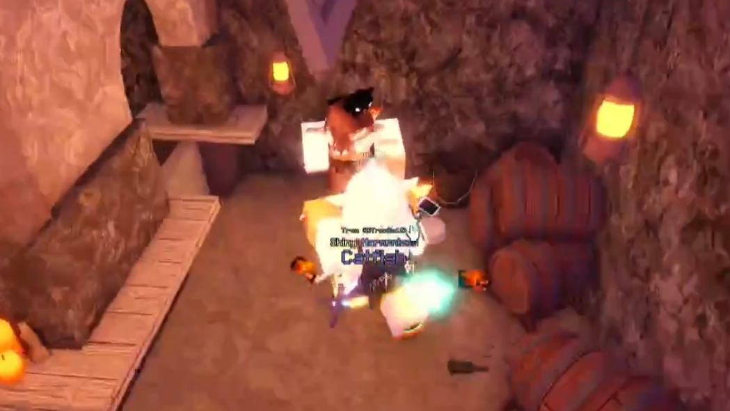 Step 4: In the dim cave area, locate the Crazy Cat Lady NPC. Hold out the Shiny Harmonized Catfish, then press E on the "Crazy Cat Lady Talk" prompt to interact.