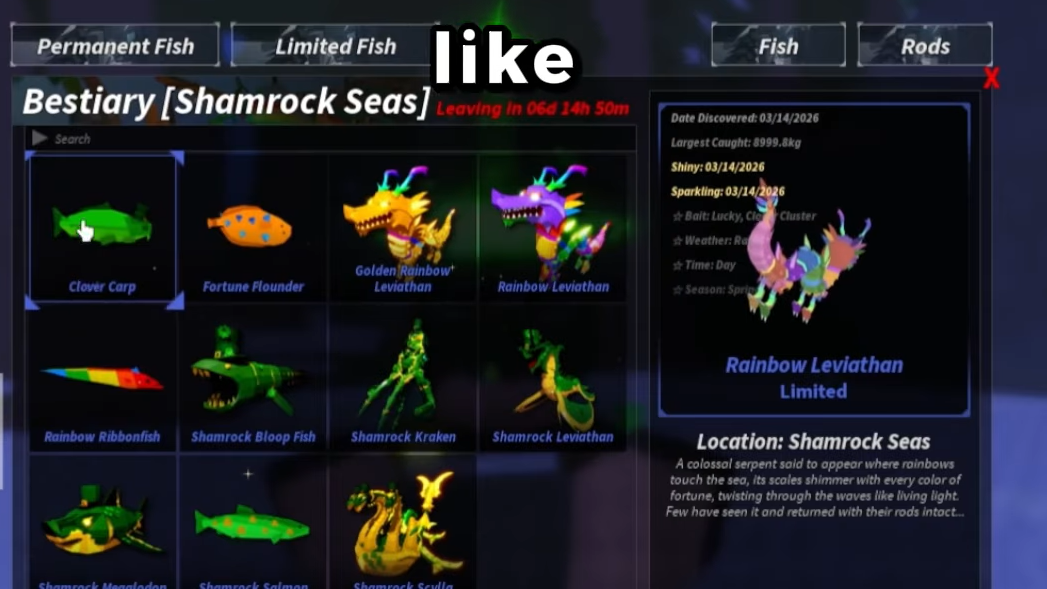 | Catch 1 Golden Rainbow Leviathan | x10 Clover Cluster, Shamrock Leviathan boat |