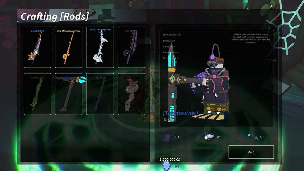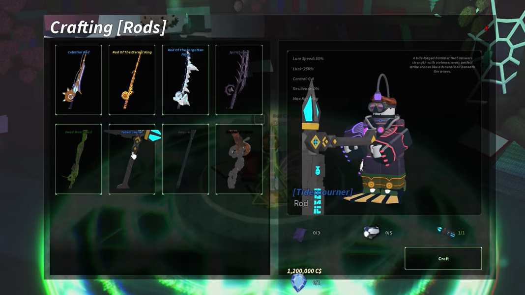 Step 3: Select the Tidemourner rod from the list of craftable rods. Confirm that you have all the required materials and enough C$, then press the Craft button to create the rod.