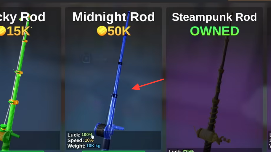 The Midnight Rod is a Rare shop rod that costs around 50,000–100,000 coins, depending on tuning. It offers about 100% Luck, 10% Speed, and 10,000 kg weight.