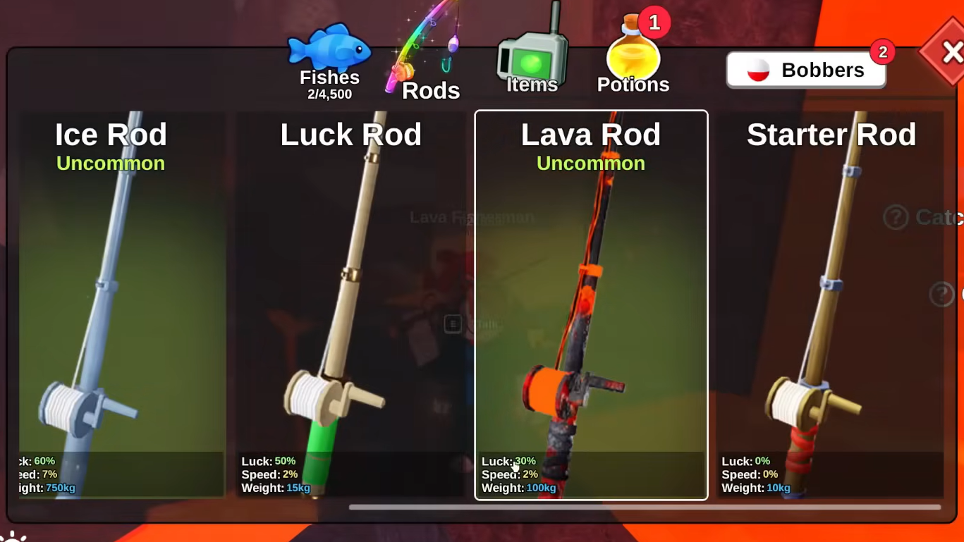 | Lucky rod | Rare | Buy from the rod store | Luck 130%, Speed 7%, low Weight |
