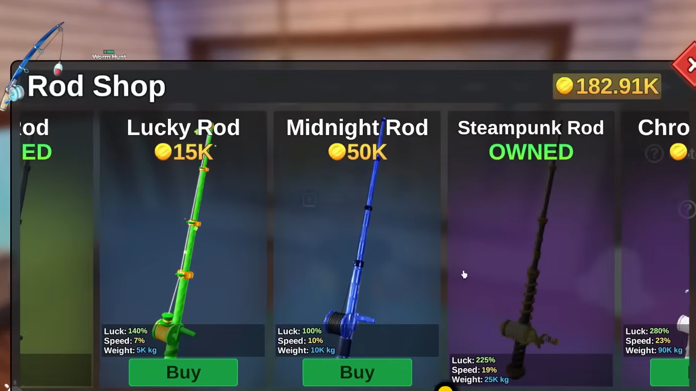 - Luck rod is a cheap store option with 50% Luck, which helps rare fish show up, but it has a tight Weight cap and only 2% Speed.